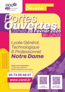 Le Lycée Polyvalent Notre-Dame de Villefranche-sur-Saône ouvre ses portes au public le samedi 28 février 2026, de 9h à 12h30. Cette matinée sera l’occasion pour les familles et les futurs élèves de découvrir l’ensemble des formations proposées au sein du lycée général, technologique et professionnel, d’échanger avec les équipes pédagogiques et éducatives, et de visiter […]