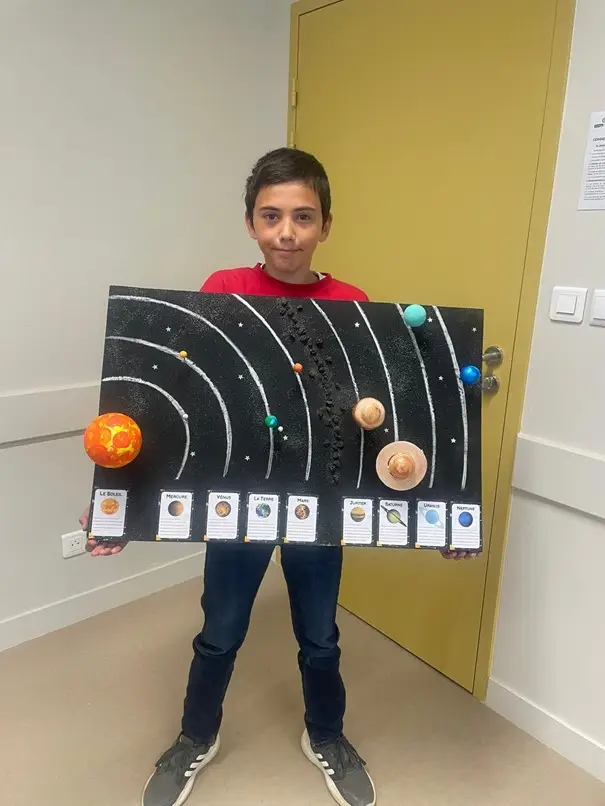 Avec les 6e1 qui n’avaient pas fait de maquettes, elle a poussé le projet plus loin, en organisant un spectacle auprès des CP, CE1 et CE2. Le déroulement a nécessité un travail de préparation important : en petits groupes, les élèves ont entrepris des recherches sur internet pour maîtriser toutes les connaissances relatives à un astre du système solaire puis ont peint une affiche pour illustrer ce qu’ils représenteraient. Ensuite, ils ont mis en scène leur spectacle.