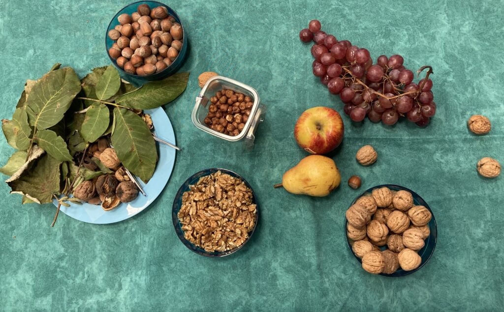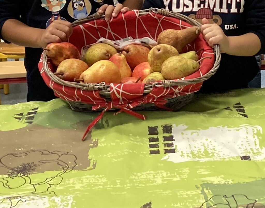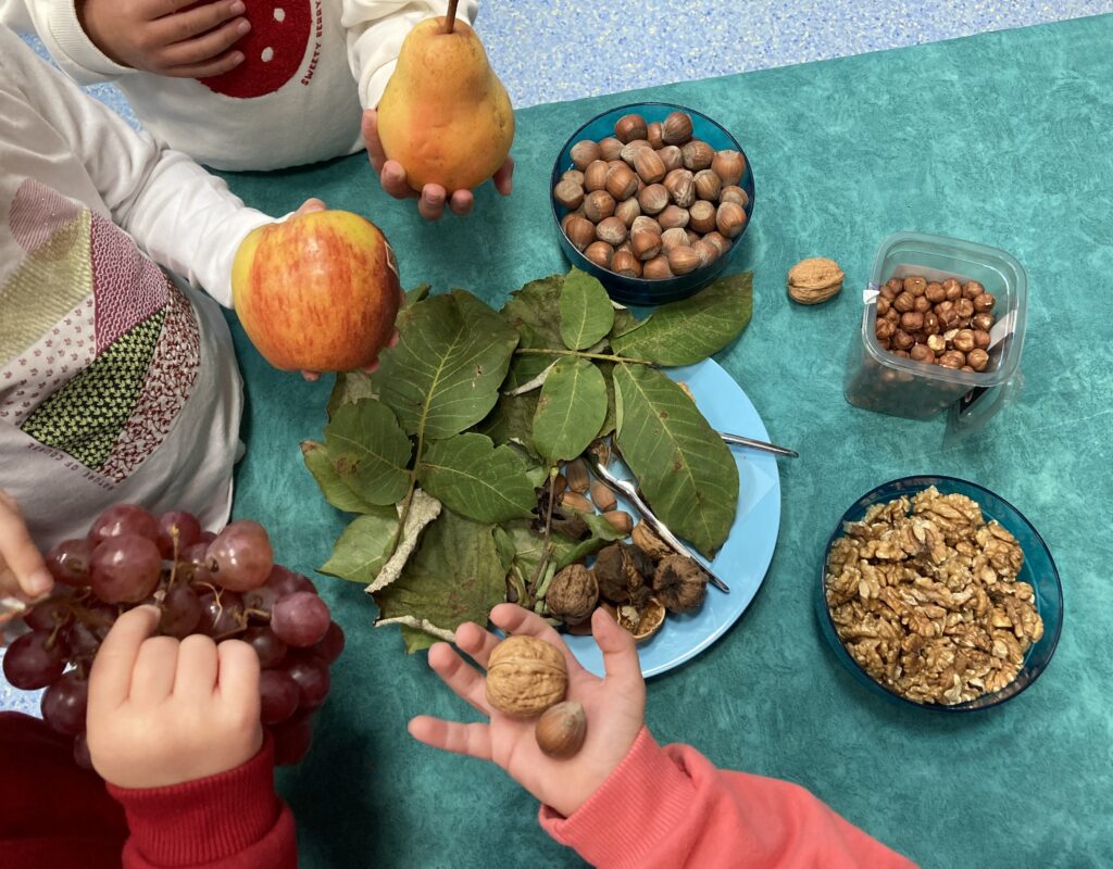 Le lundi 13 octobre, la semaine du goût a commencé dans la bonne humeur en admirant une belle corbeille de pommes colorées qui ont ravi tous les enfants, lors de la dégustation, quel que soit la couleur et la saveur de la pomme, du rouge au jaune, du sucré à l’acide ! Puis le mardi, dégustation de poires fondantes, suivie par raisins frais et secs, le jeudi. Le vendredi fut l’occasion de gouter aux noix et noisettes avec quelques figues du verger d’Augustyne !
