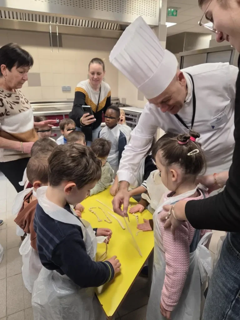 Le vendredi 5 décembre 2025, les deux classes de Petite Section et de Moyenne Section ont passé une matinée pleine de gourmandises et de découvertes au CFA. Pour l’occasion, les enfants ont été mélangés et répartis en trois groupes, et chaque groupe a tourné à tour de rôle sur les différents ateliers, ce qui leur a permis de tout découvrir et de participer à chaque activité.