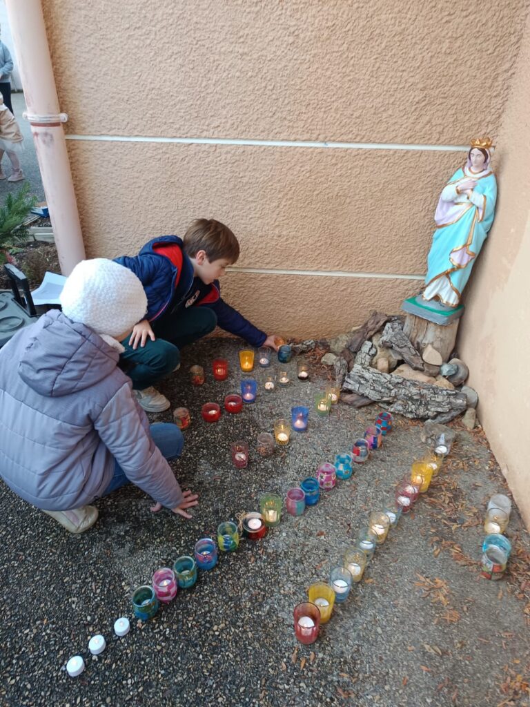 Dans l’école, les élèves ont déposé des lumignons devant la statue de Marie fraîchement restaurée par Mr Vaissière Lestrade, un parent d’élèves.