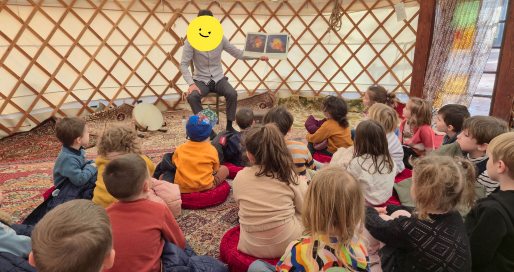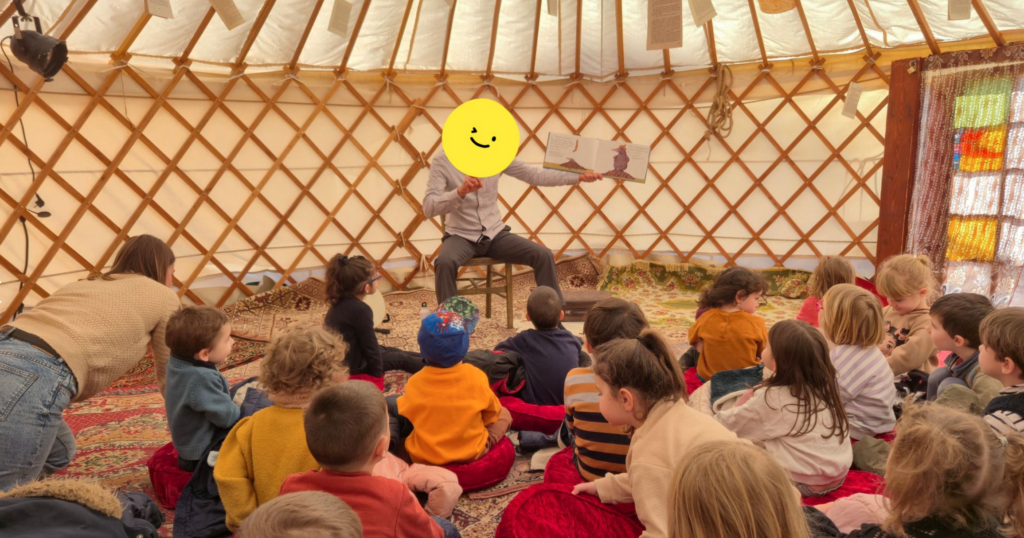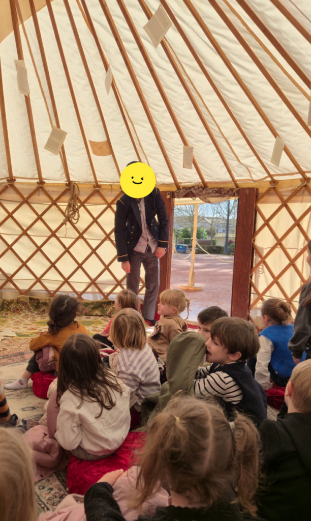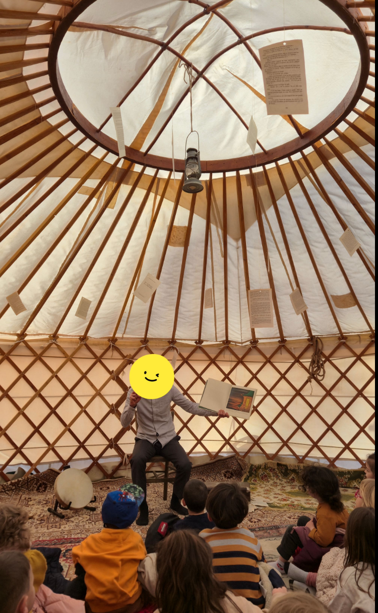 Installés dans une yourte, les élèves ont assisté à une lecture de 3 livres. Pour les maternelles, les enfants ont apprécié les livres suivants : la tempête ( Florence Seyvos et Claude Ponti), Pétoche le poussin froussard (Pierre Delye et Cécile Hudrisier) et De la petite taupe qui voulait savoir qui lui avait fait sur la tête (Werner Holzwarth et Wolf Erlbruch).