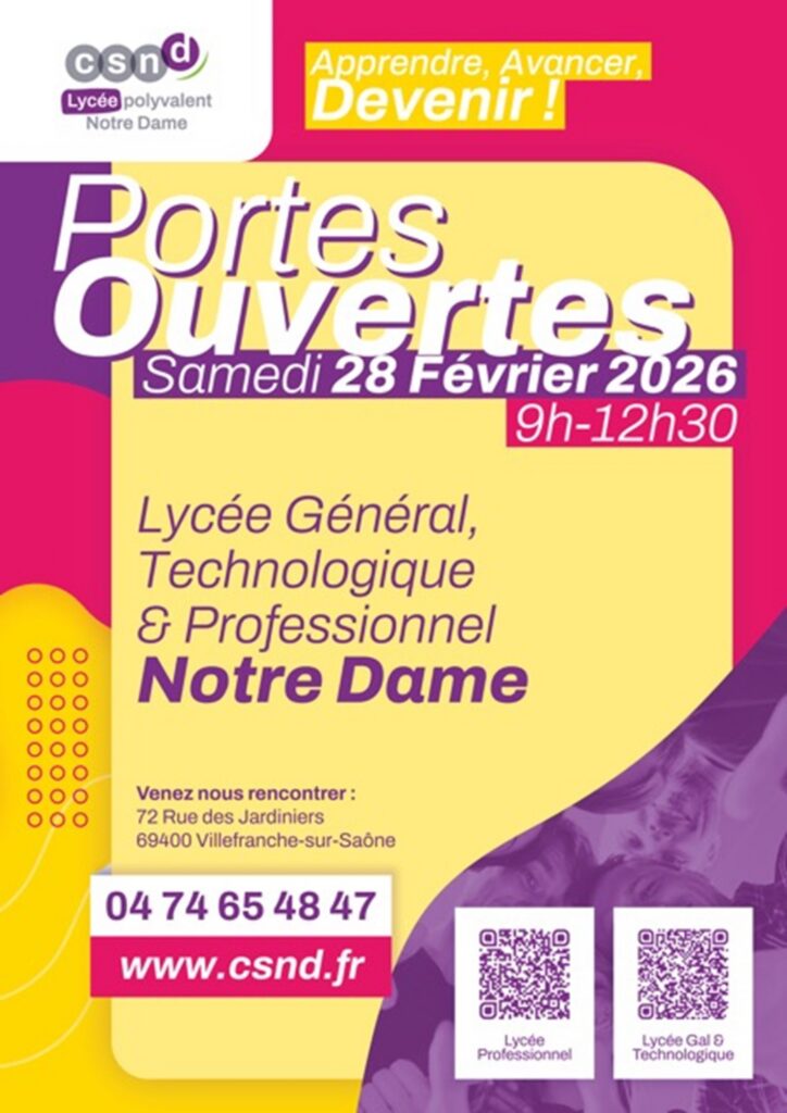 Le Lycée Polyvalent Notre-Dame de Villefranche-sur-SaÎne ouvre ses portes au public le samedi 28 février 2026, de 9h à 12h30.